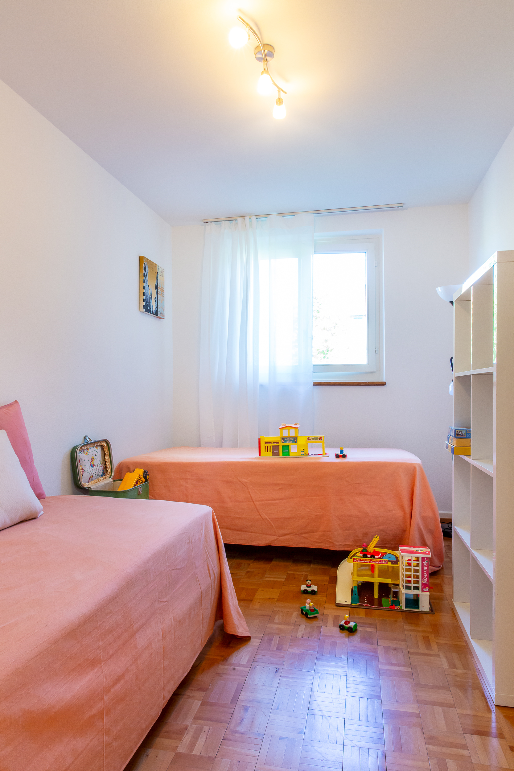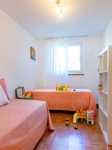 Unsere Gästewohnung ist eine kleine 3-Zimmer-Wohnung. Sie umfasst: 1 Wohnzimmer, 2 Schlafzimmer, Küche, Dusche und WC. Interessent:innen können je nach Bedarf 1 oder 2 Zimmer mieten. Das erste Zimmer ist mit einem Doppelbett für 1 bis 2 Personen ausgestattet. Das zweite mit 2 Einzelbetten und 1 zusätzlichen Matratze. Parkmöglichkeiten sind nicht vorhanden.